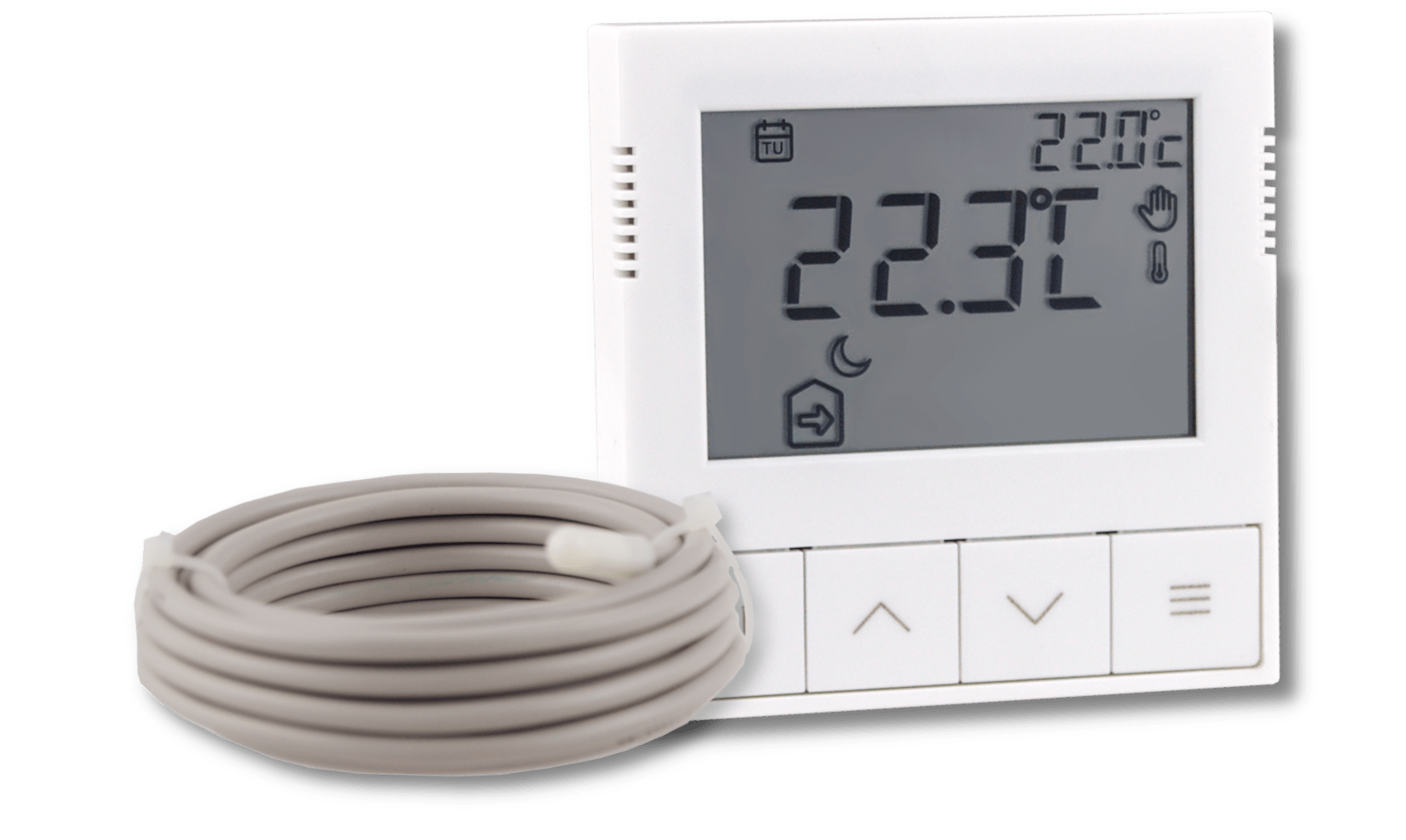 Prekidač (maks. prekidačko opterećenje 2000 W), zaštita IP 31, sonda poda (NTC640-10k) dužine 3 m je uključena u pakovanje.